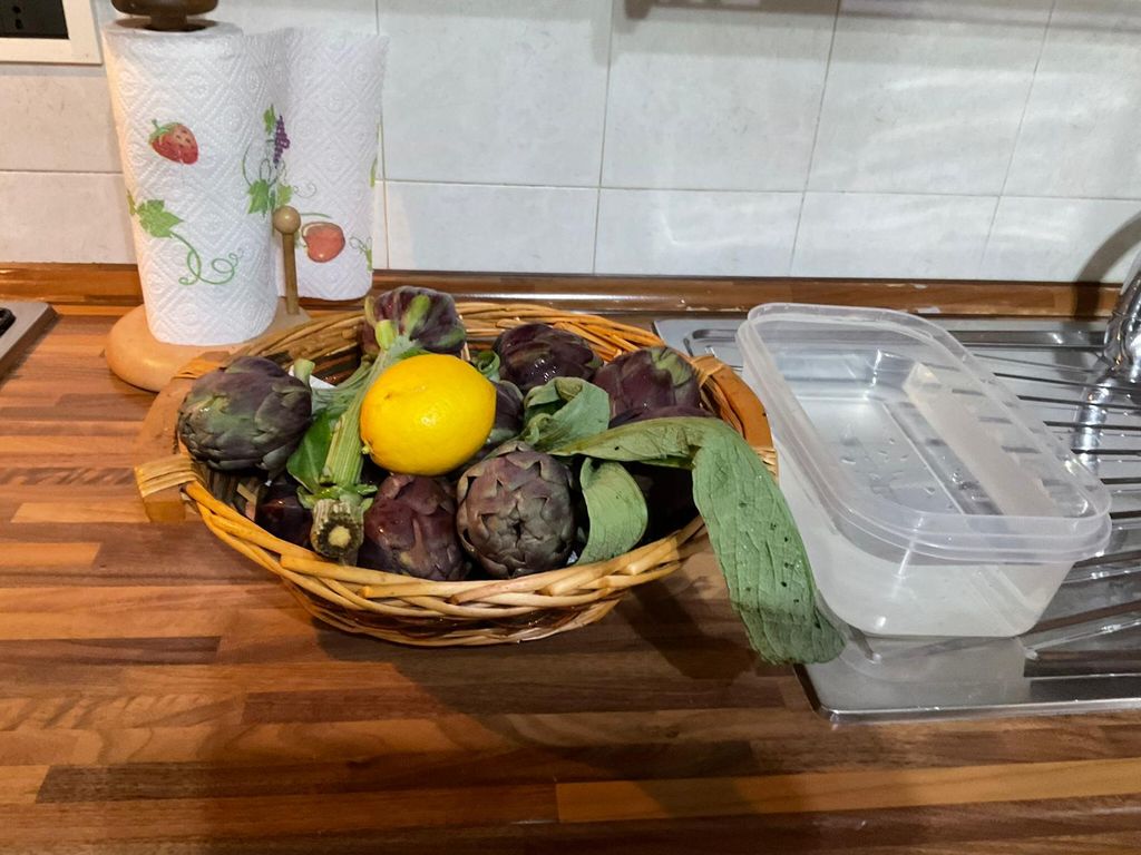 Prepara dell’acqua e spremi il limone 🍋 eviterà che i carciofi anneriscano (se ti manca il limone puoi utilizzare 2/3 cucchiai di farina che ha lo stesso effetto)
