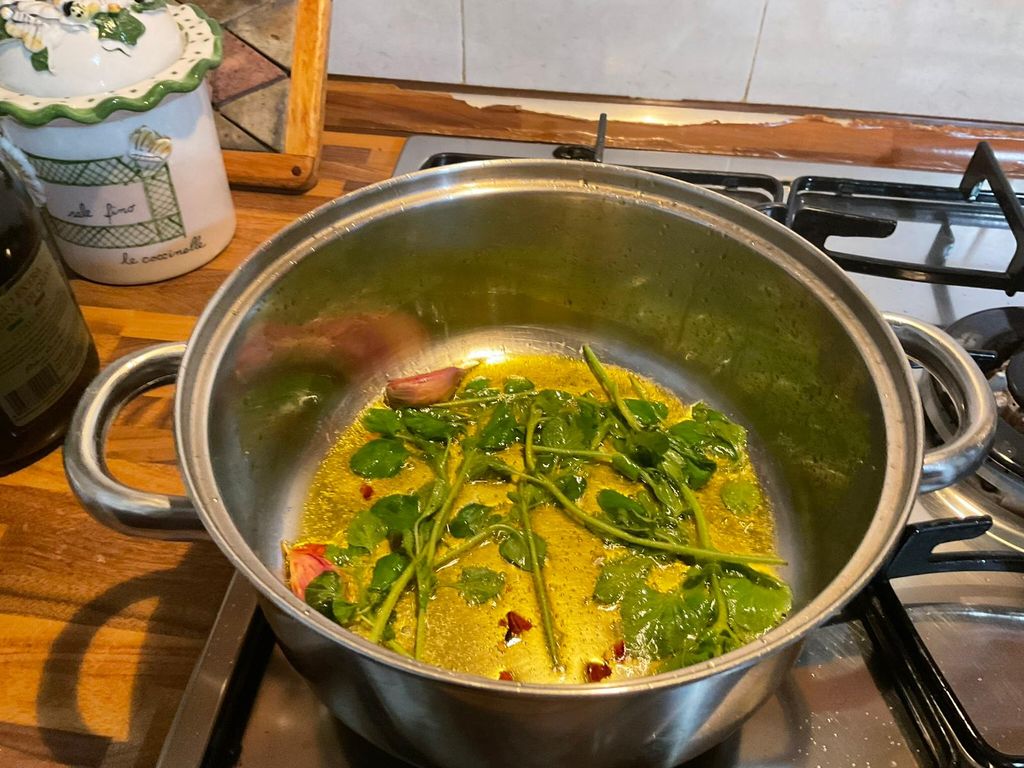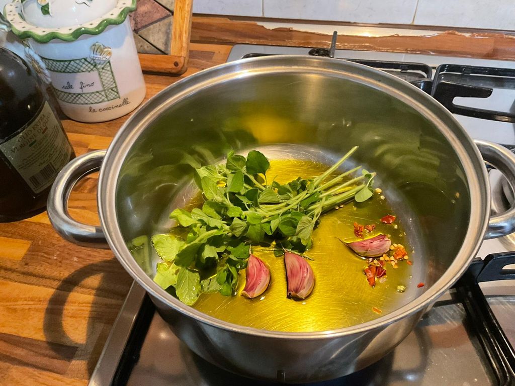 Adesso prendi un tegame o una padella dai bordi alti, aggiungi l’olio, la mentuccia, gli spicchi di aglio vestito e il peperoncino 🌶