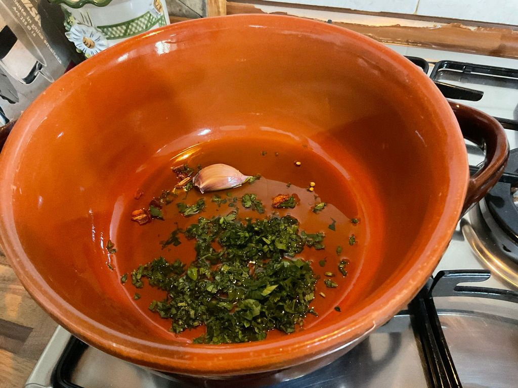 Intanto procurati un tegame di coccio, ma va bene anche un tegame di acciaio dal fondo spesso ed aggiungi l’olio, l’aglio e il peperoncino 🌶.