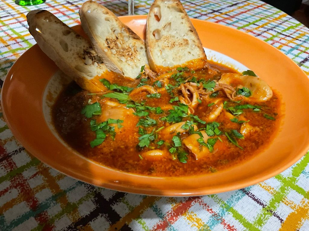 Nel frattempo abbrustolisci il pane 🥖 poi versa i polipetti in una fondina ed aggiungi altro prezzemolo tagliato sottile ed il pane abbrustolito🥖