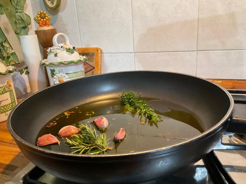 Intanto prepara una padella dal fondo spesso aggiungi l’olio evo, l’aglio, il rosmarino e il peperoncino 🌶